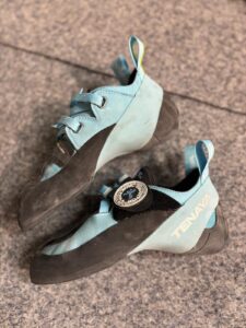 This was one of my first “real” climbing shoes, and it made me fall in love with feeling the wall beneath my feet. Still one of my favorites for flowy, balance-based climbs. I love their comfort as I tend to climb long sessions, all I need to do in the middle of training is just open the Velcro for better blood circulation and that’s it, no need to take them off completely.